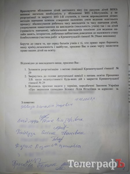 «Беручи до уваги те, що серед батьків учнів є ті, хто саме зараз боронить нашу країну, незалежність і майбутнє, просимо вас своєю чергою захистити право наших дітей на освіту», йдеться у листі. Батьки попросили зупинити реорганізацію з метою ліквідації Кременчуцької гімназії №29