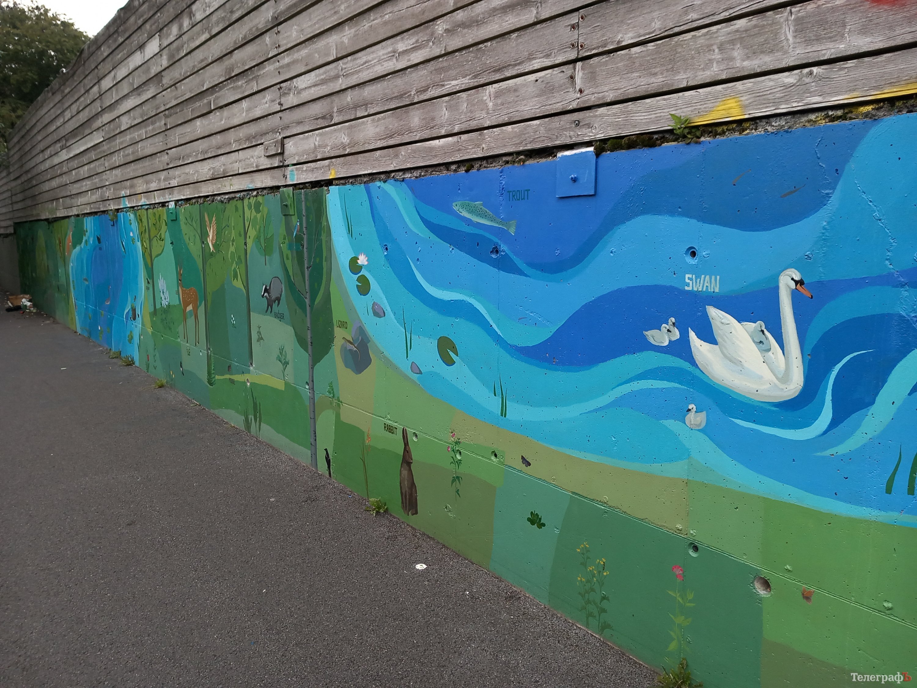 30-ти метровий мурал прикрасили лебеді й горобина, зайці та лисиці у зеленому лісі: кременчужанка намалювала ірландські рослини і тварин, аби дітки вивчали свій край.