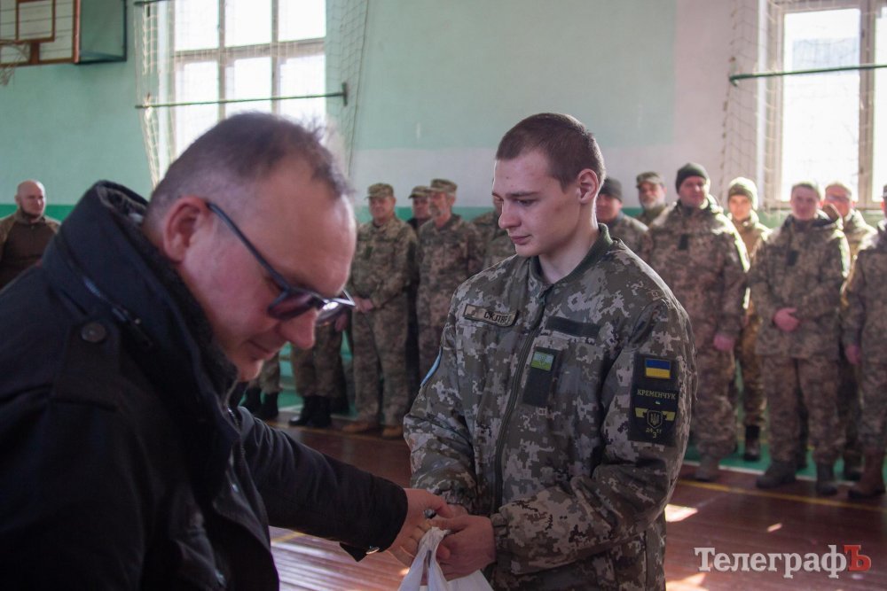 А третім добровольців привітав керівник Волонтерського штабу оборони Кременчука Олег Биков, який згадав не тільки про рашистських ворогів, яких потрібно знищувати, а й про внутрішніх ворогів, назвавши їх «українськими гнидами». Він вручив добровольцям, відзначеним наказом командира Кременчуцького добровольчого куреня, цінні подарунки.