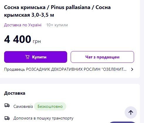 Сосну кримську (висотою 2,5-3 м) придбали по 5 500 грн за штуку. Ми знайшли аналогічні за висотою в інтернеті від 1 700 грн (акційна пропозиція) до 4 400 грн. Різниця з вищою ціною 1 100 грн. На 40 соснах це приблизно 40 тисяч переплати (уже за мінусом доставки).