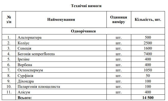 - Однорічні квіти (11 найменувань, 14 500 штук). Очікувана вартість закупівлі 350 тисяч гривень, аукціон призначений на 3 квітня.