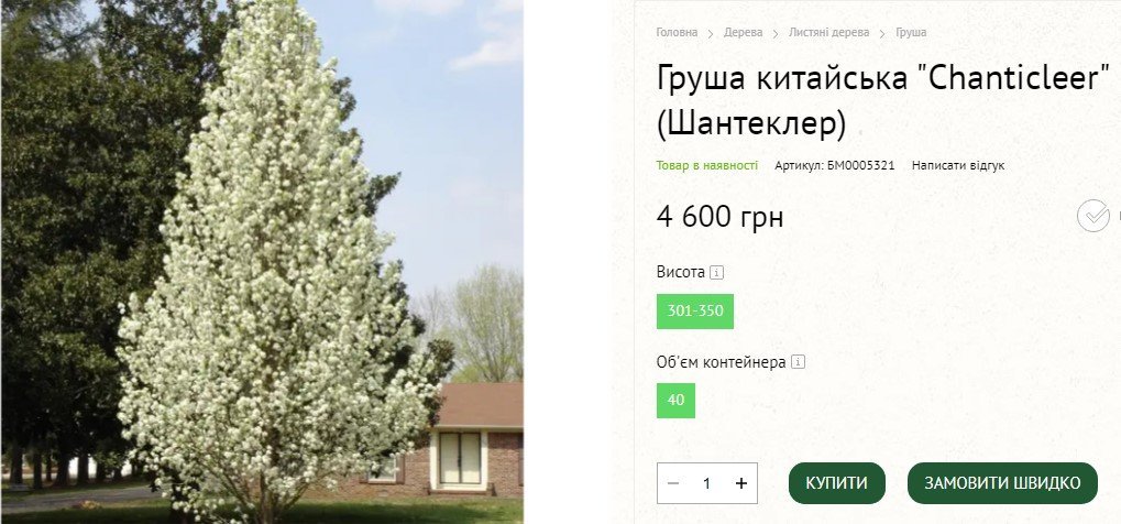 Декоративна груша «Каллері Шантеклер» (висотою 3,5-4 м) за 11 175 гривень за штуку цьогоріч є найкоштовнішою. Таких КП «Благоустрій Кременчука» купило дві. Такі ж два саджанці у менших контейнерах (тобто з меншою кореневою системою) — по 9 790 грн за штуку. Цін на повні аналоги товару (за всіма параметрами) ми не знайшли. Та схожий товар в одному з інтернет-магазинів (висота 3-3,5 м) є за ціною 4 600 грн. На одній груші Кременчук переплачує вдвічі.