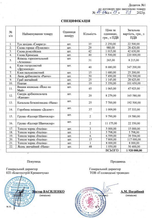 Пропозиція ТОВ «Голландські троянди» на 80 тис. грн менша за очікувану вартість закупівлі, визначену замовником — 2 млн грн. Чи є це реальною економією? Подивимося, почому купили дерева та кущі. Ось специфікація до договору, розміщеного у Prozorro.