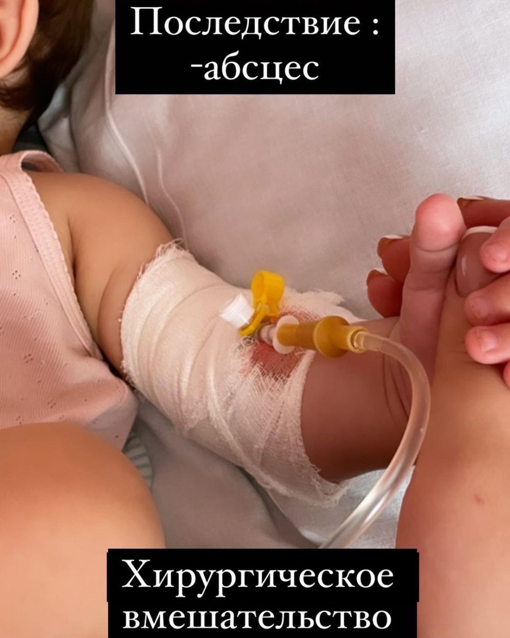 Днями у соціальній мережі інстаграм кременчужанка Євгенія опублікувала допис про інцидент, який стався з її 7-місячною дочкою Кірою у Кременчуцькій міській дитячій лікарні. У дитини піднялася температура, і батьки привезли її у медзаклад на лікування. Там малій зробили жарознижувальний укол у сідницю, а після цього на тому місці виникло почервоніння та затвердіння, а пізніше — абсцес. Цей абсцес потребував хірургічного втручання, і зараз дівчинку водять на перев’язки. У цьому дописі користувачі інстаграму позначили «Кременчуцький Телеграф».