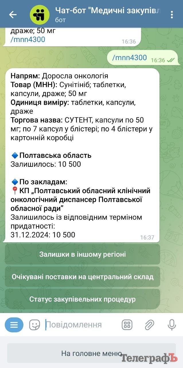 У відповіді на запит «Кременчуцького Телеграфу» у Кременчуцькому онкодиспансері зазначили, що препарат «Сутент» отримували від Полтавського обласного клінічного онкодиспансеру у двох дозуваннях: