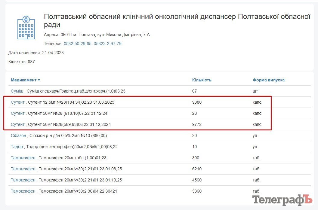 І дійсно, на сторінці Полтавського онкодиспансеру на «Доступних ліках» можна побачити залишки «Сутенту» 12,5 мг і 50 мг. Остання дата оновлення інформації — 21 квітня 2023 року.
