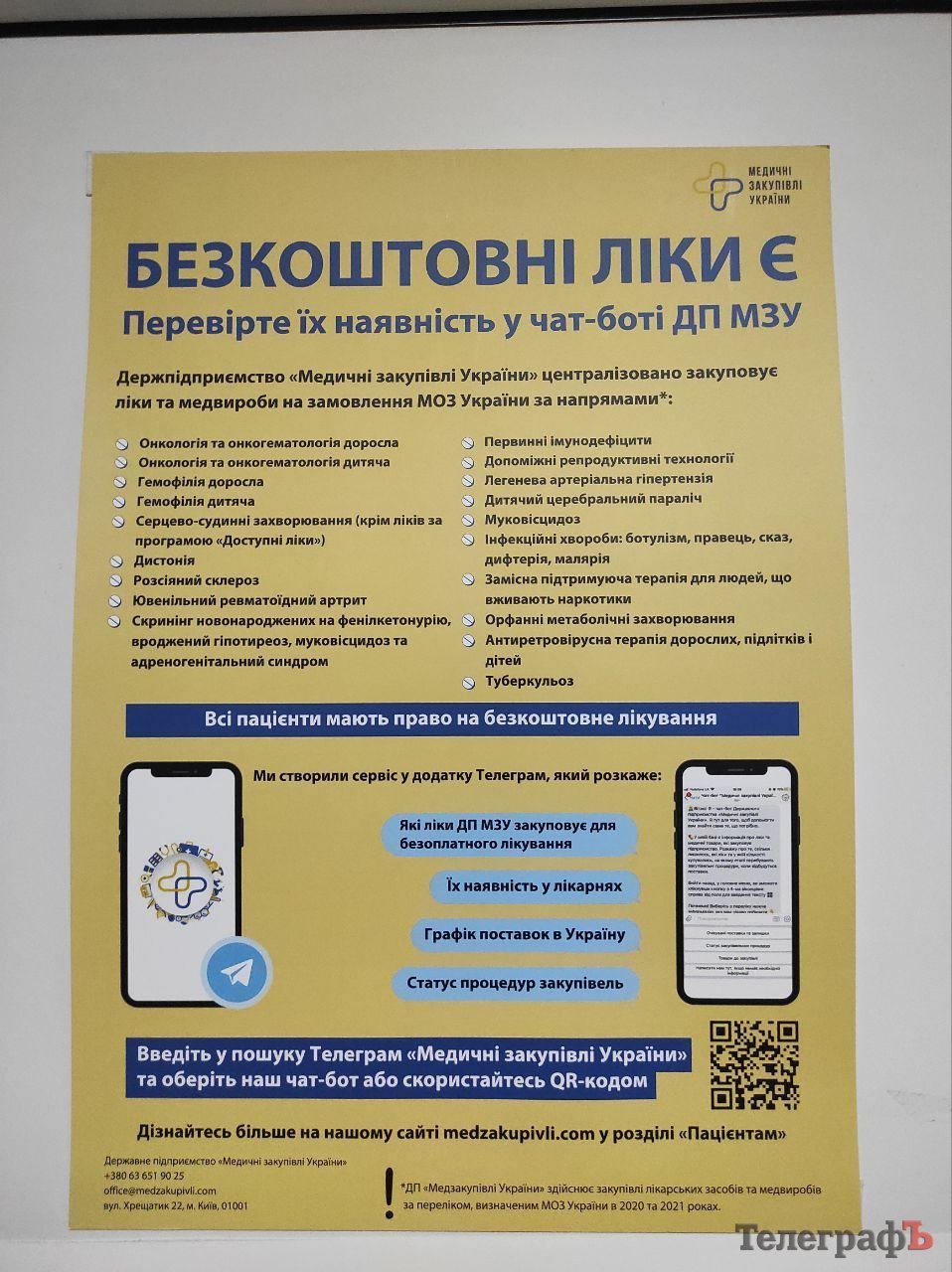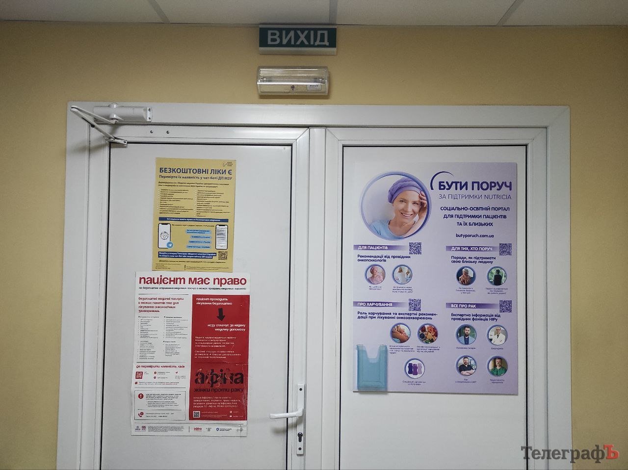 Зокрема на дверях висить інформація про чат-бот у Telegram «Медичні закупівлі України», в якому можна самостійно перевіряти наявність безоплатних ліків і медвиробів у лікарнях України.