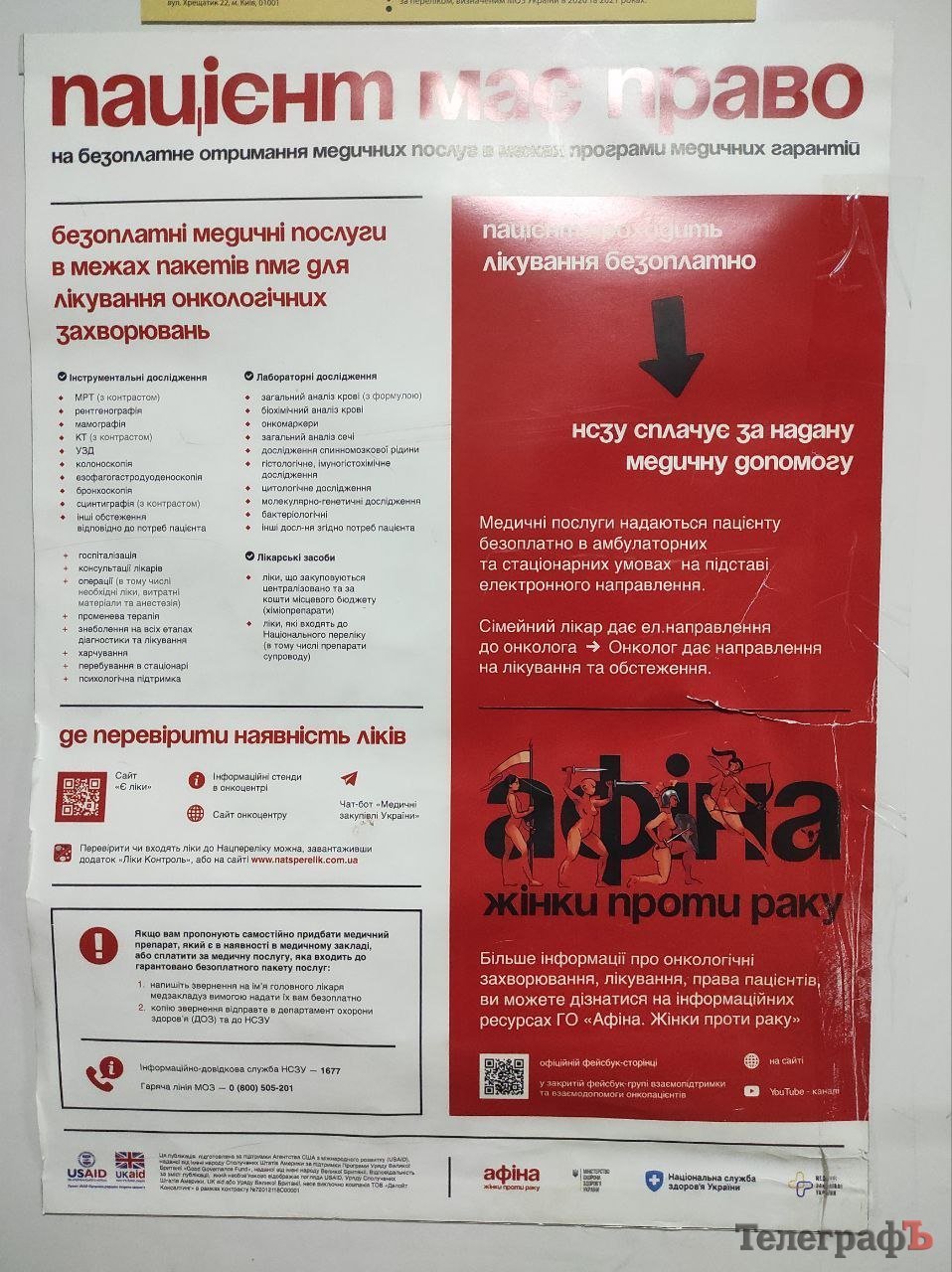 У коридорі стаціонару, поруч із кабінетом головного лікаря висять інформаційні матеріали, з яких пацієнти та їхні рідні можуть отримати інформацію щодо безоплатних ліків і медичних послуг, гарантованих державою. А також поради щодо того, куди звертатися, якщо хворим пропонують придбати щось чи оплатити послуги, які мають бути безоплатні.