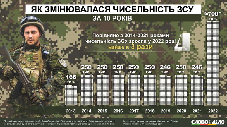 Але з початком російсько-української війни чисельність Сил оборони України почала зростати. Законом України № 235-VIII від 6.03.2015 року нормативна чисельність ЗСУ була збільшена до 250 тисяч, у тому числі 204 тисячі військовослужбовців. У липні 2021 року чисельність ЗСУ знову збільшили – до 261 тисячі (215 тисяч військовослужбовців). Зауважимо, що окрім ЗСУ ще кількасот тисяч військовослужбовців на той час перебували у складі Національної гвардії України, Державної прикордонної служби, СБУ та інших силових відомств.