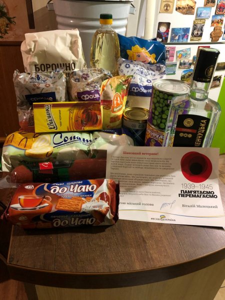 Територіальні центри соцзахисту населення цього тижня традиційно роздали продуктові набори до Дня пам’яті та перемоги над нацизмом у Другій світовій війні. До продуктового набору увійшли крупи, цукор, борошно, олія, консерви, печиво, солодощі та... пляшка горілки. Набір супроводжувала листівка, підписана міським головою Віталієм Малецьким із побажанням Божого благословення, здоров’я та мирного неба з нагоди Дня пам’яті та перемоги над нацизмом.