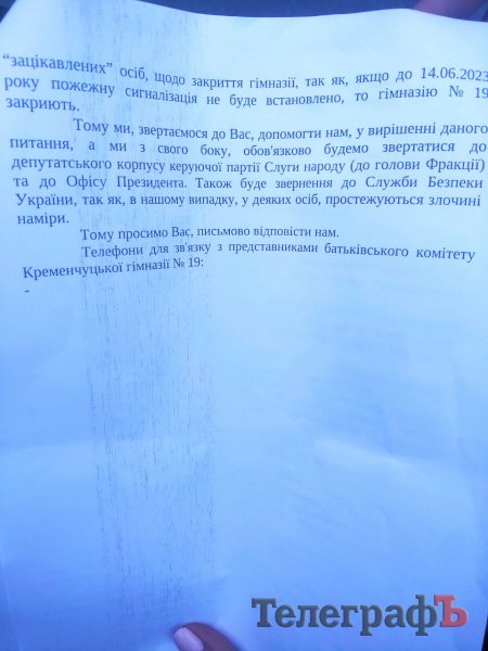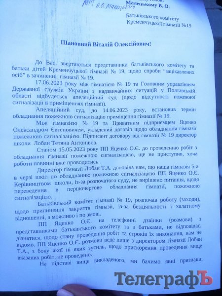 15 травня під мерією Кременчука знову був мітинг батьків. Цього разу до міської ради прийшли мами та тати учнів гімназії №19, стурбовані можливим закриттям школи. Річ у тому, що у цьому навчальному закладі неможливо обладнати укриття (школу побудували на старому кладовищі). А через відсутність пожежної сигналізації цю гімназію закрили за рішенням суду. Тому батьки разом із дітьми прийшли до міського голови Віталія Малецького — вимагати, аби школу через ці причини не закривали, а з 1 вересня учні стали до навчання в офлайн-форматі, як це планується в інших школах міста.