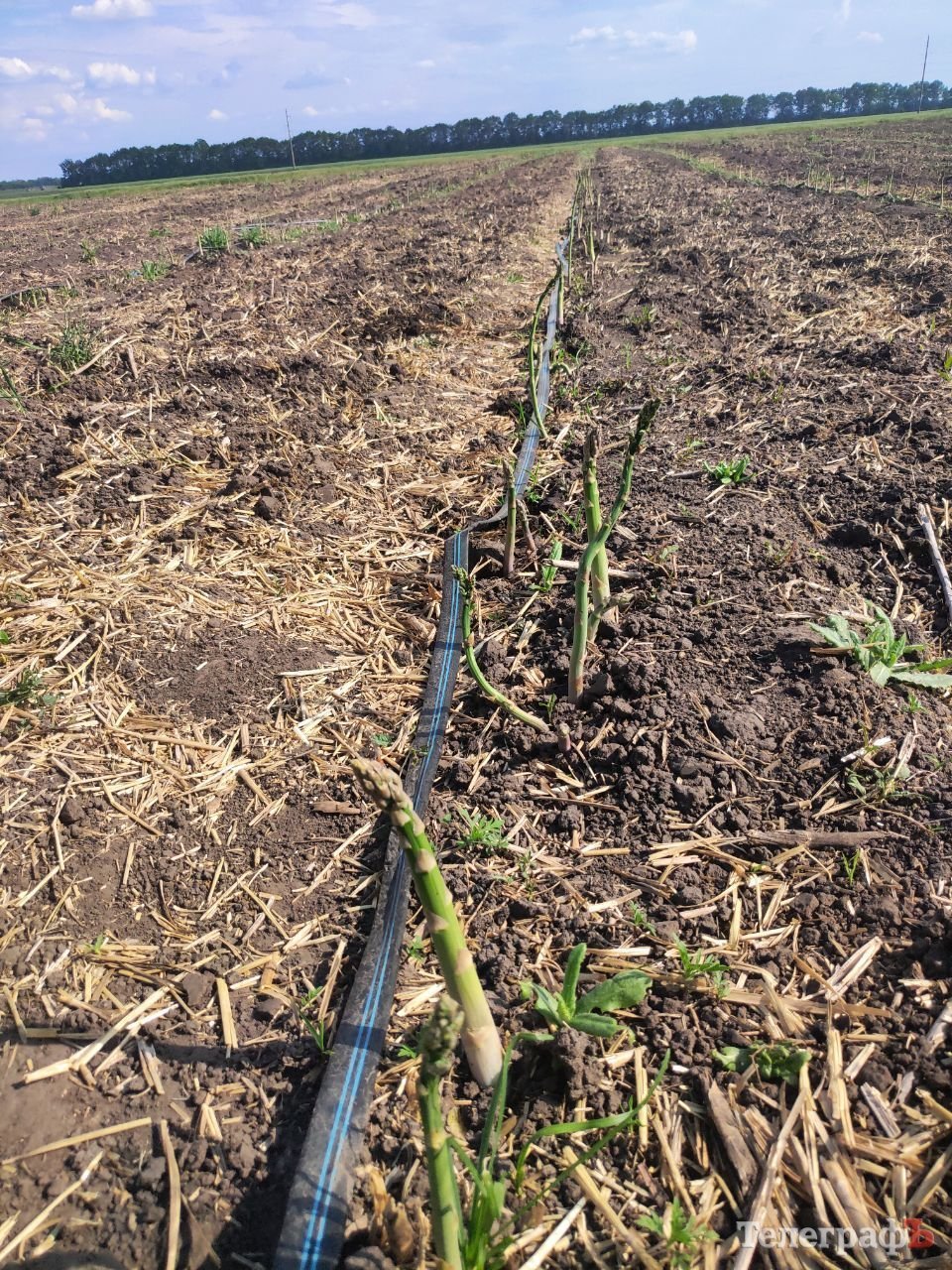 На одній ділянці ростуть невеликі паростки спаржі, під постійним крапельним поливом. На іншій — зарості холодку. Олександр розповідає, що аспарагусовий сад заклав у 2020 році. Перший врожай збирали минулого року.
