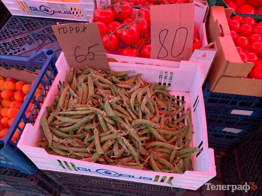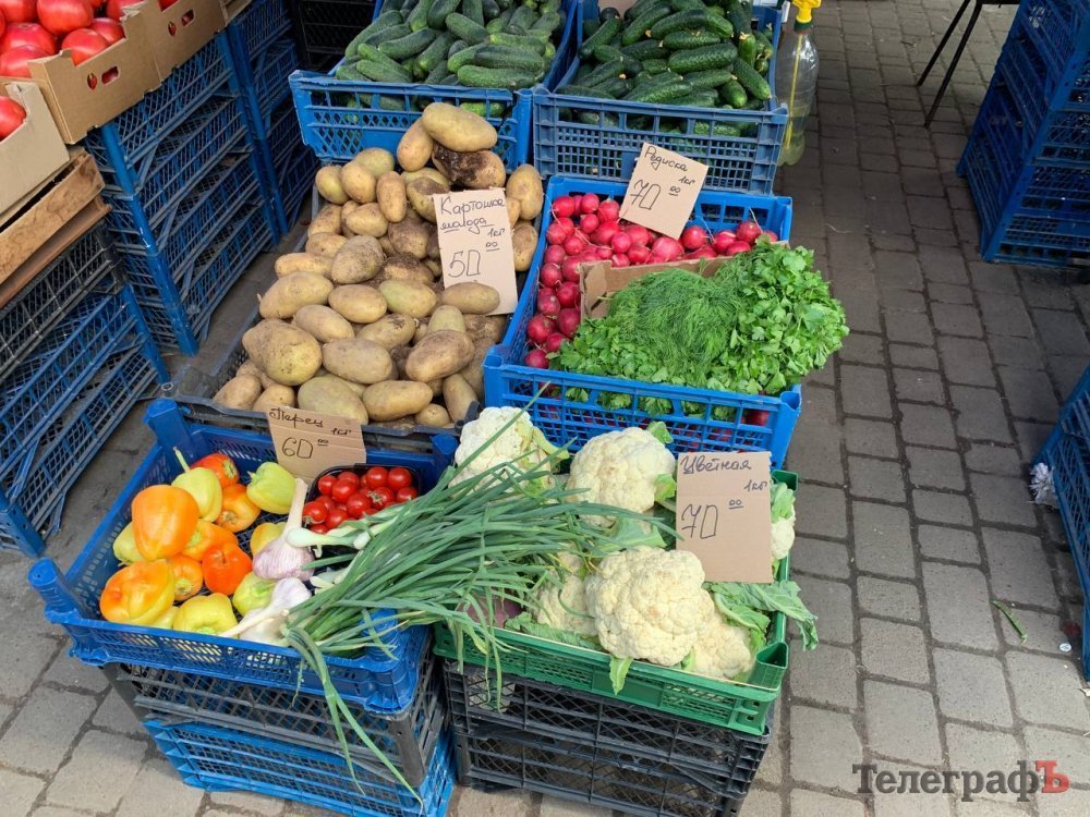 Як кажуть місцеві продавці, зараз молоді огірки, капусту, кабачки, картоплю, буряк та зелений горох вирощує переважно Одеса та Ізмаїл. Помідори та огірки часто возять з теплиць Нікополя та Омельника. Полуницю зараз вирощують усі, тож на прилавках ринку вона з’являється з Умані, Черкасів та Світловодську, але під час подорожі ринком ми помітили бабусь, які торгують місцевою полуницею, зі свого городу. Зустрічається і домашня черешня. А ось стару картоплю, моркву, цибулю та капусту привозять до Кременчуцького ринку з різних місць, вдосталь і місцевої городини.