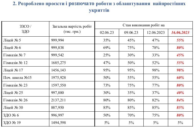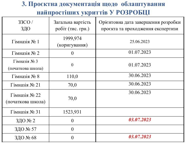 3. Для деяких навчальних закладів зараз тільки розробляють проєкти щодо облаштування сховищ. Тут йдеться про гімназії №1, 2, 3, 8, 21, 22, 31 та дитсадки №2, 56, 68.