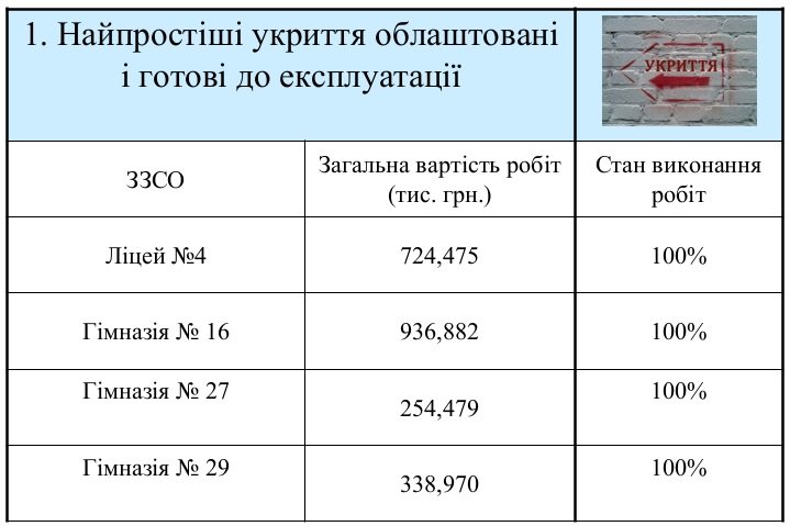 1. Укриття готові у ліцеї №4, а також гімназіях №16, 27, 29.