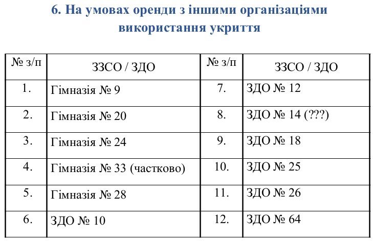 6. Тут ми бачимо, які навчальні заклади використовуватимуть укриття на умовах оренди.