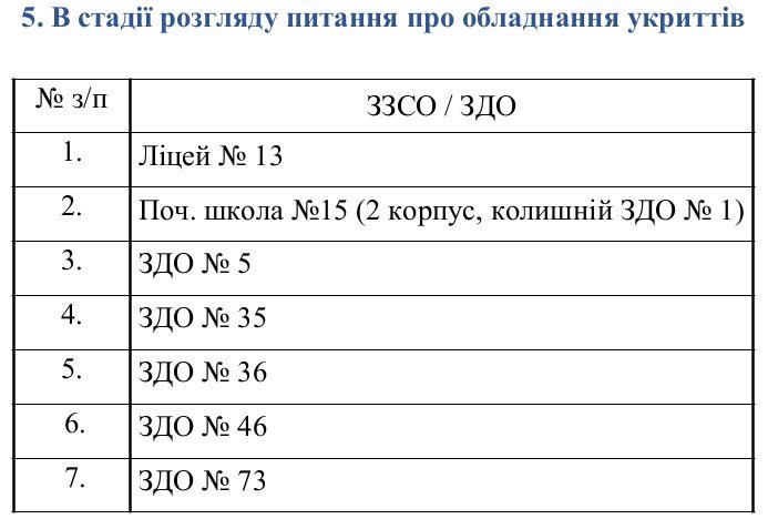 5. А тут ми бачимо, що у ліцеї №13, 2 корпусі початкової школи №15 та дитячих садках №5, 35, 36, 46, 73 розглядають питання про обладнання укриттів.
