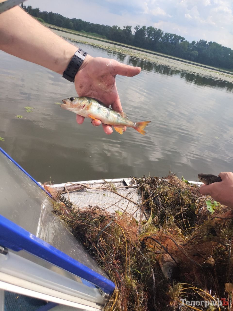 Ознак сіток на поверхні води не видно, втім, досвідченим оком таки вгледіти можна. Олександр Саламатін бере заготовлений залізний прут із довгою мотузкою — перевіряє, чи справді є сітка. Є. Витягують потроху, сітка вся у водоростях, є риба.