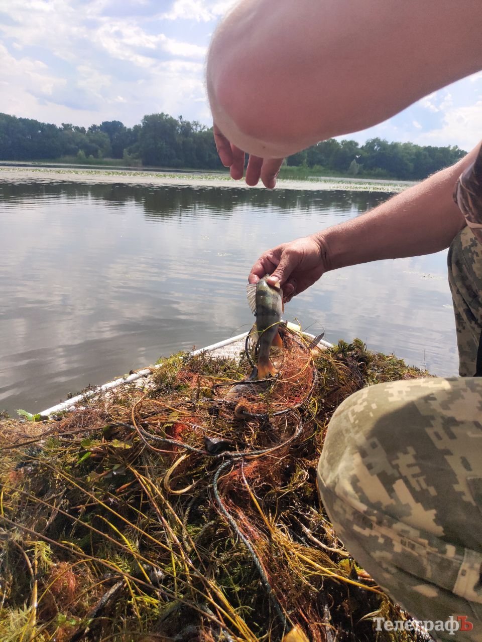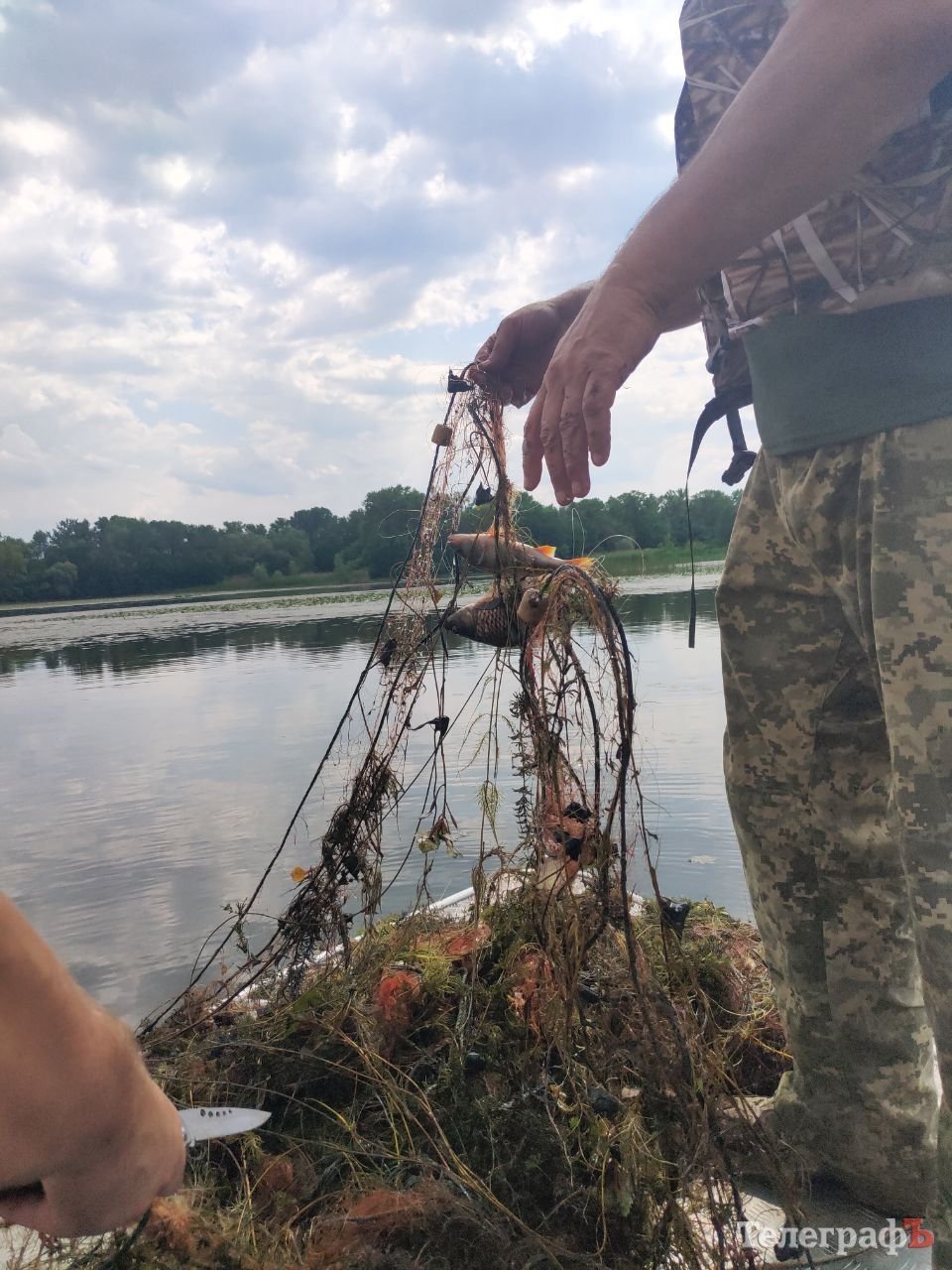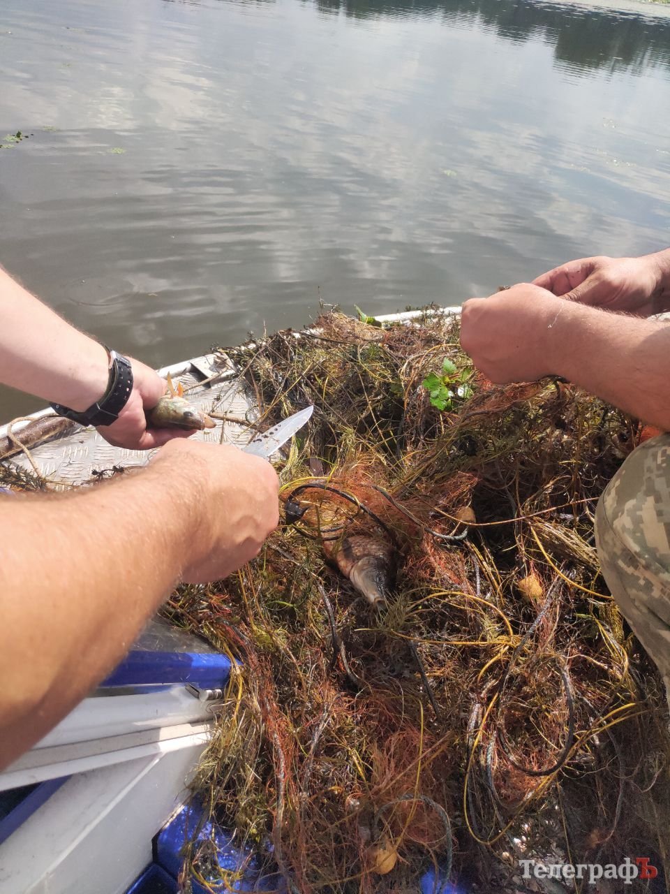 Природоохоронці потроху витягують сітку на борт. У ній різних розмірів — коропи, карасі, плоскирки, потрапило кілька окунів. Ножем розрізають сітку і всю рибу випускають у воду.
