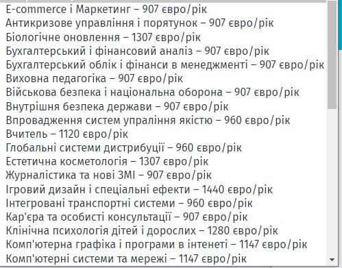Найдешевші напрямки, пов'язані із хімією, електрикою, фізикою, машинобудуванням, металургією, аграрними науками, екологічним напрямом, будівництвом, автотранспортом.