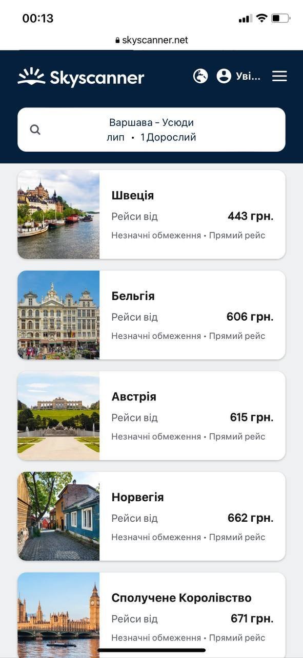 - З Варшави — Швеція, Бельгія, Австрія, Норвегія, Британія, Італія — 500-900 грн. Латвія, Чехія, Франція, Данія, Нідерланди, Хорватія, Ірландія — до 1500 грн.