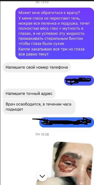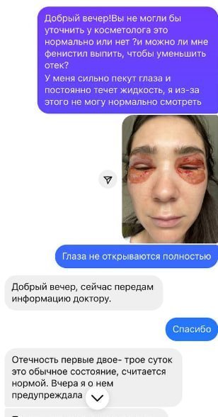 У неділю мені стало гірше. Це був просто пекельний біль. Все обличчя припухло, я не могла розплющити очі, вже майже не бачила — хіба що краєм ока. Написала про свій стан, запитала, чи потрібно звернутися до лікаря. Власниця салону мені запропонувала надіслати лікаря, який приїде мене оглянути вдома. Мов, навіщо мені їхати до лікарні, аби мене там такою бачили. Приїхав лікар-офтальмолог, привіз із собою рецептурну мазь. Я запитала його, чи все зі мною добре. Лікар відповів, що так, це така процедура, така технологія.