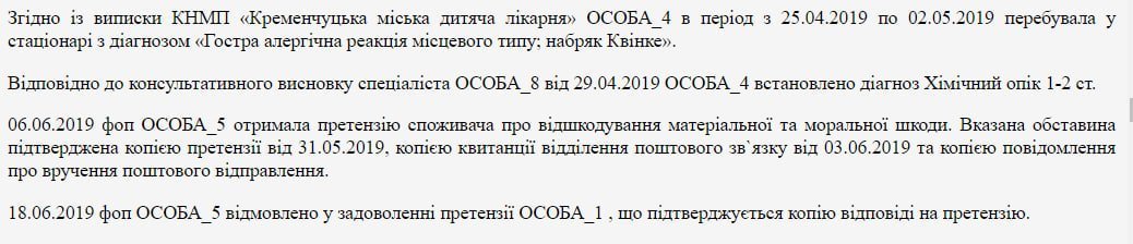 Ми знайшли у судовому реєстрі справу щодо цього випадку. Згідно із позовною заявою, кременчужанка подала до суду на майстра (яка виконувала процедуру і Євгенії), бо «у квітні 2019 року, під час проведення процедури пілінгу її донька відчула печіння на обличчі, у неї почалась сльозотеча, утруднення дихання, запаморочення, про що ОСОБА_6 повідомила відповідача. Однак відповідач, ігноруючи скарги дитини на різке погіршення самопочуття, наполягала на продовженні процедури та не змила розчин для пілінгу. У доньки з’явились ознаки анафілактичного шоку. Було викликано швидку медичну допомогу і доньку госпіталізовано. Внаслідок проведення процедури Єлизавета проходила лікування з діагнозом «Гостра алергічна реакція місцевого типу, набряк Квінке». Також, після проведення додаткового огляду було діагностовано хімічні опіки обличчя 1-2 ступені. Внаслідок проведення процедури неповнолітній ОСОБА_4 було завдано моральну шкоду, розмір якої відповідно до висновку експерта становить 50000 грн».
