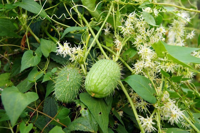 Ехіноцистис шипуватий або їжакоплідник виткий (Echinocystis lobata) — занесена до України зі США та Канади однорічна рослина у вигляді ліани завдовжки до 6 метрів, яка полюбляє захоплювати у лісі заплавну місцевість понад річкою. Ліани заплітають усі дерева, звішуючи колючі «огірки» з чорними насінинами всередині. Гарно квітують, але це алергійна рослина. Цю рослину інколи називають «скажений огірок» (Ecballium), але це інший вид й він на території міста не зустрічається.