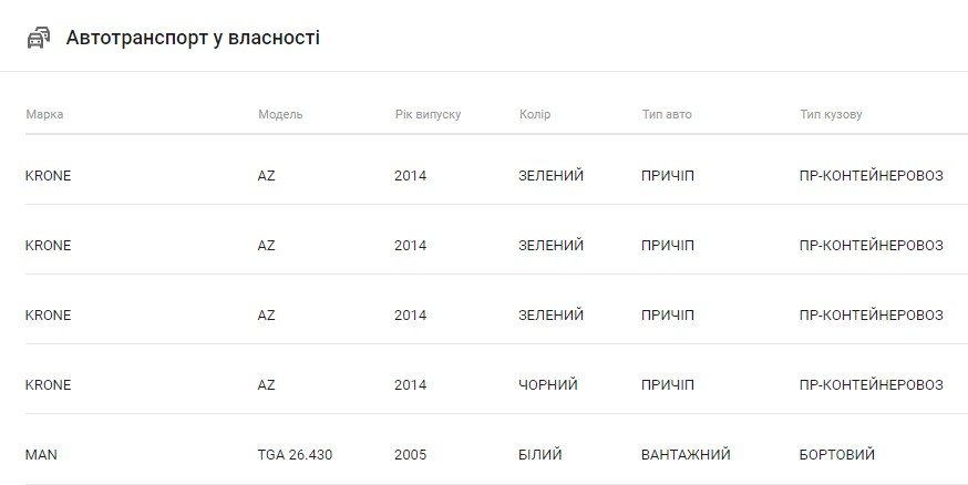 Але завдяки звіту замовника у Prozorro, ми знаємо, що принаймні один із куплених в ТОВ «Активбуд-М» товарів це причіп марки KRONE. За даними аналітичної системи YouControl, яка агрегує дані з відкритих державних реєстрів, у тому числі з реєстру нерухомого майна, фірмі «Активбуд-М» (за даними на 26 серпня) належить чотири причепи цієї марки, усі 2014 року випуску, завезені у 2023 році з Німеччини. Імовірно, рідний брат цих причепів із партії, яку придбали під конкретну закупівлю, і був поставлений замовнику.