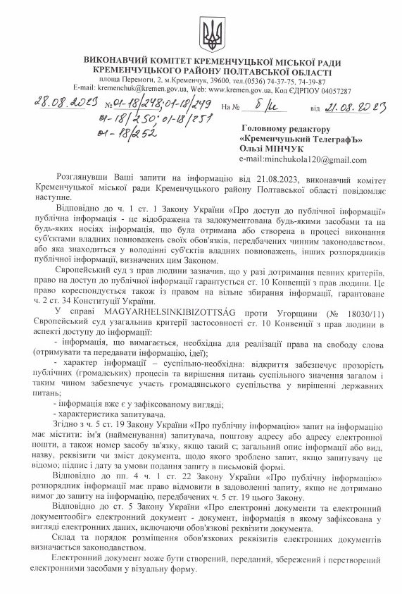 Чи є ціни адекватними? Як уже зазначено, договори на закупівлі причепів не оприлюднені, крім додаткової угоди у травні. Але і в ній не зазначена марка товару та рік його випуску. Тож порівняти ціни на 12 причепів, які поставило ТОВ «Активбуд-М», наразі можливості немає. «ТелеграфЪ» направив низку інформаційних запитів виконкому Кременчуцької міської ради. Ми просили угоди на постачання причепів з усіма додатками. Та замість відповіді нам надійшла відписка, про неї трохи згодом.