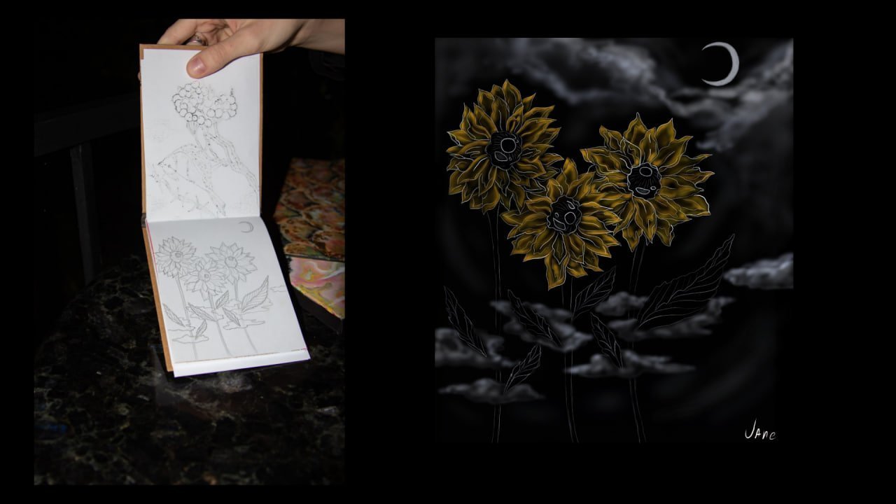 Скетч про соняхи, який присвячений попереднім рокам до повномасштабного вторгнення, АТО, створювався паралельно з «Азовсталь». Надалі цю картину Жанна диджиталізувала.