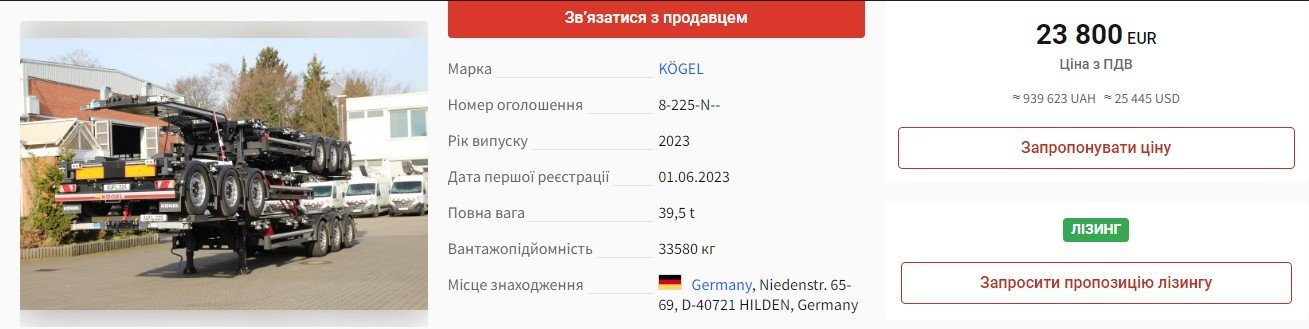 Причіп, марка KOEGEL 2015 року випуску (вірогідно, той самий, який фігурував у матеріалах суду) мерія придбала у ТОВ «Активбуд-М» за 1 млн 150 тис. грн, еквівалент 31?430 EUR за курсом 39,54. Але ж за такою ціною на профільних автосайтах за кордоном пропонують нові причепи KOEGEL, 2023 року випуску.