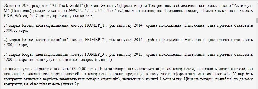 Отже, 6 квітня ТОВ «Активбуд-М» купило причепи в німецької компанії «A1 Truck GmbH» з німецького міста Бакум (Bakum). Усі причепи зі слідами корозії та зносом покришок 50-65%. Загальна сума контракту склала 10?900 EUR (за курсом це 431 531 грн), включно з митом і платежами, пов’язаними з виконанням формальностей за контрактом у країні продавця (Німеччині), у тому числі оформленням митних платежів на території цієї країни. У вартість контракту також включена вартість завантаження причепів.