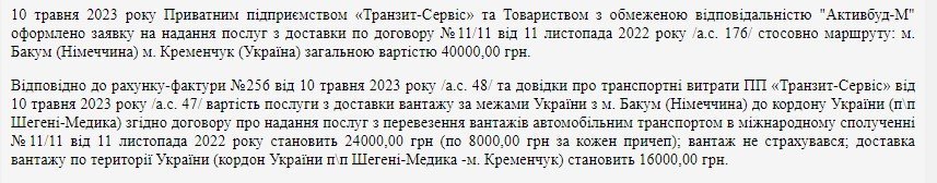 У митну вартість включена вартість доставки територією Німеччині до України — по 8000 тис. грн за кожен причіп. Доставка територією України — 16 тис. грн за всю партію.