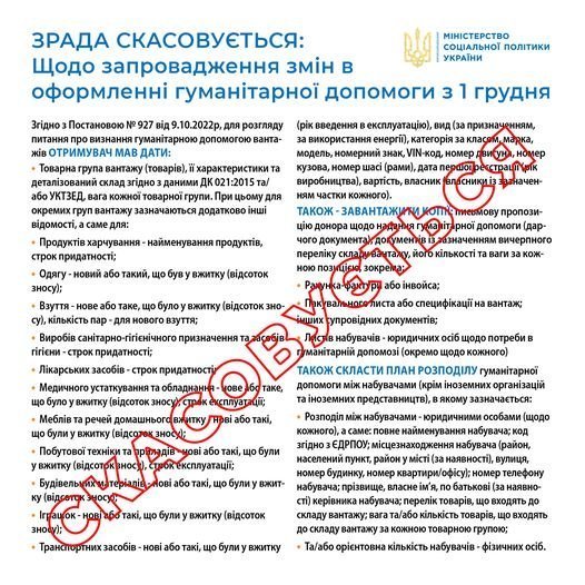 Міністерство соціальної політики спершу намагалося заспокоїти волонтерську спільноту та 13 жовтня заявило про спростування інформації щодо необхідності подачі додаткових документів для ввезення гуманітарної допомоги волонтерами з 1-го грудня. Про це йдеться на фейсбук-сторінці відомства.