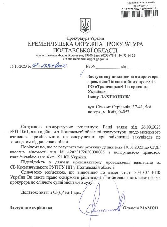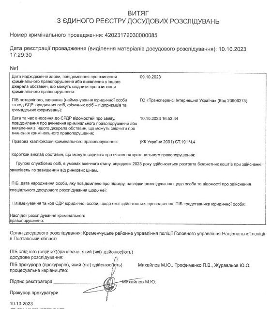 Правоохоронці відкрили кримінальне провадження з приводу можливого кримінального правопорушення, вчиненого службовими особами виконкому Кременчуцької міської ради. Йдеться про розтрату бюджетних коштів при закупівлі товарів за завищеними цінами. Заяву до прокуратури щодо ймовірного завищення цін на вживані причепи, які мерія купила для потреб військових, подала ГО «Трансперенсі Інтернешнл Україна». Наразі ця антикорупційна громадська організація отримала відповідь на свою заяву та витяг з Єдиного реєстру досудових розслідувань від 10 жовтня.