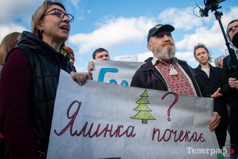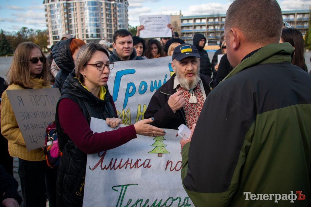 Мітингувальники вважають, що центральна ялинка на площі Перемоги не потрібна під час новорічних свят. На що мер відповів, що минулого року до двох військових з підрозділу ППО, який дислокувався у Кременчуці і захищав його, на Різдво приїхали їхні родини з Одеси та заходу України. За його словами, військові сказали: