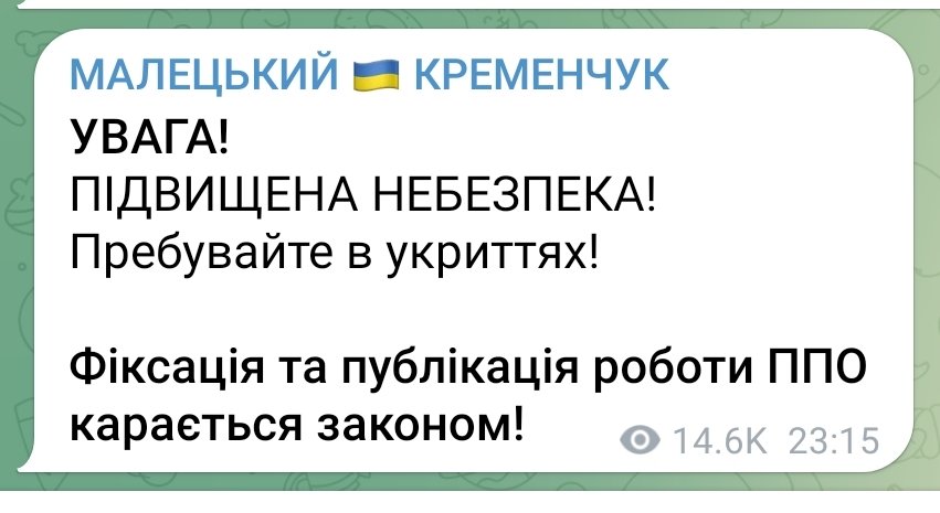 О 01.08 у Повітряних Силах ЗСУ «закликали» всіх кременчужан терміново прослідувати в укриття.