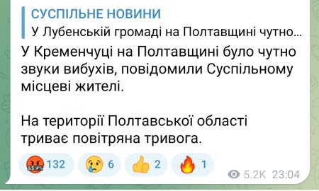 О 23.04 Суспільне повідомило, що звуки вибухів чули й у Кременчуці.
