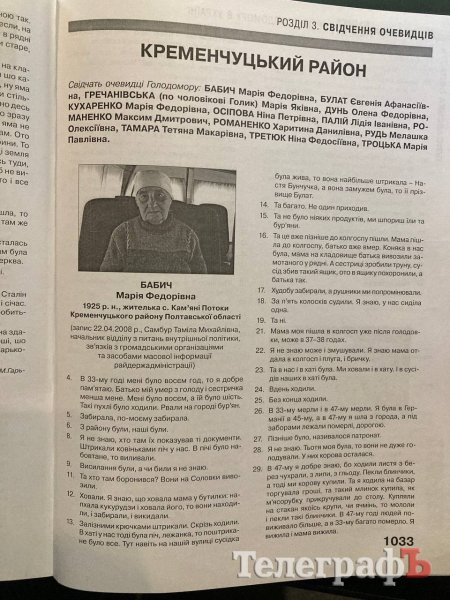 У збірнику, окрім імен жертв, також зібрані свідчення очевидців тих подій. Вони занотовані у формі цитат. Так, жителька села Кам’яні Потоки Марія Бабич каже, що в 33-році їй було 8 років. Вона пам’ятає, як від голоду померли її батько та сестра. Тоді сім’ї Марії доводилося харчуватися бур’яном з городу. Їжу вони ховали у пляшках, проте представники радянської влади «находили, і забирали, і викидали» харчі.