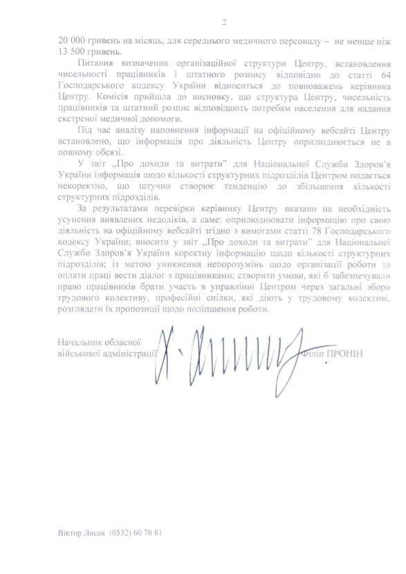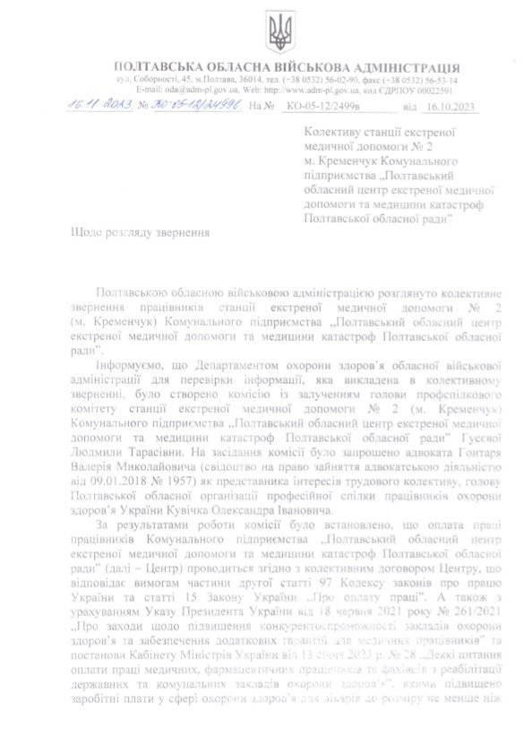 У розпорядження редакції також потрапив лист-відповідь на колективне звернення співробітників Кременчуцької станції екстреної медичної допомоги, який підписав голова Полтавської ОВА Філіп Пронін. Далі ви можете ознайомитися з текстом.