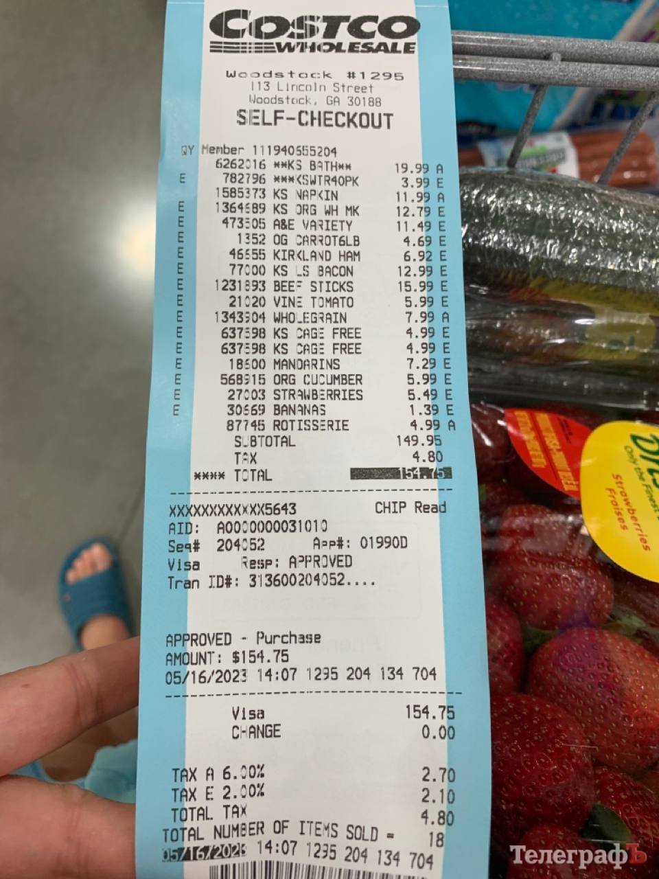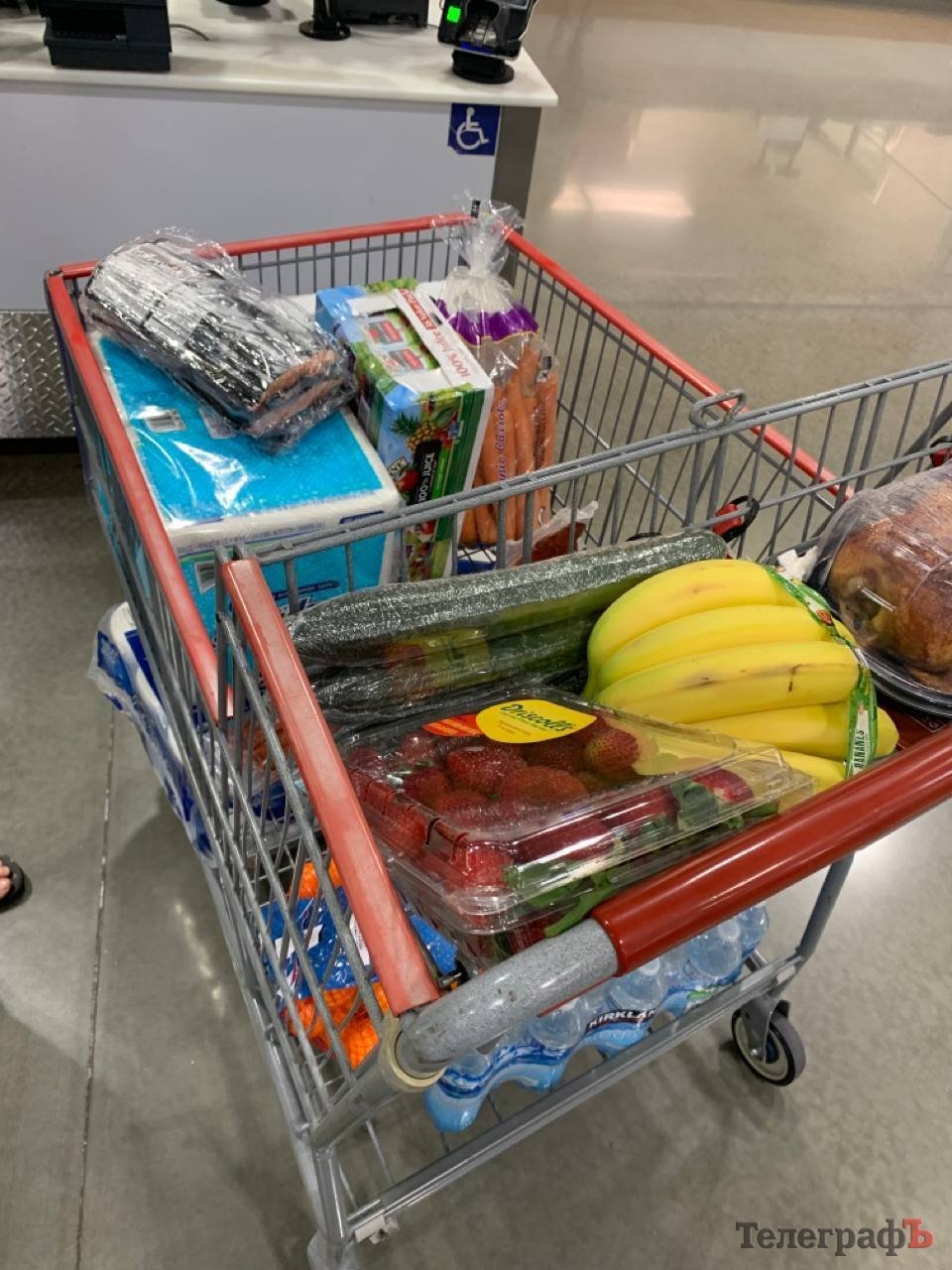 Ось це на 150 доларів — тут бекон, три літри молока, сік для дитини, яйця, мандарини, морква, огірки, полуниця, банани, смажена готова курка, туалетний папір, питна вода, серветки.