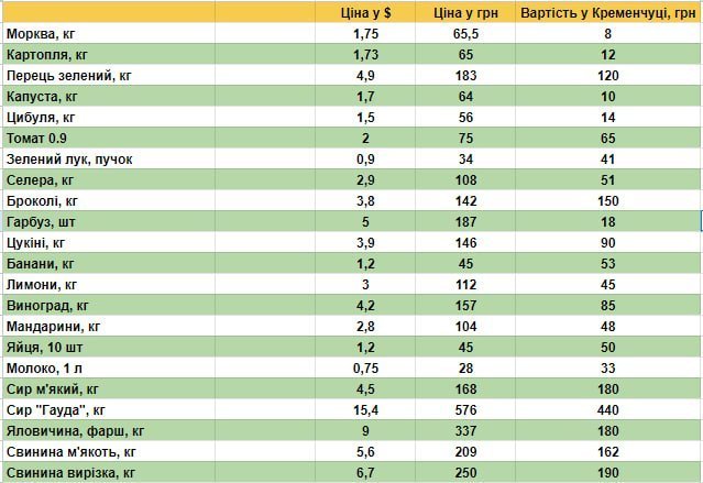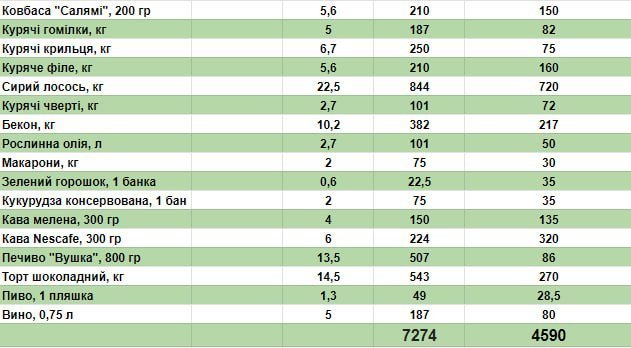 Зібрати однаковий кошик для двох родин, що мешкають через океан, не вдалось, адже вони віддають перевагу різним продуктам. Тож ми підрахували співвідношення витрат, виходячи з цін на продукти, які надала кременчужанка: скільки один набір продуктів коштує у її штаті та у Кременчуці. У США цей набір продуктів лише в 1,6 раза дорожчий… Використані цінники з супермаркетів-дискаунтерів — вони можуть бути вищими в інших магазинах.