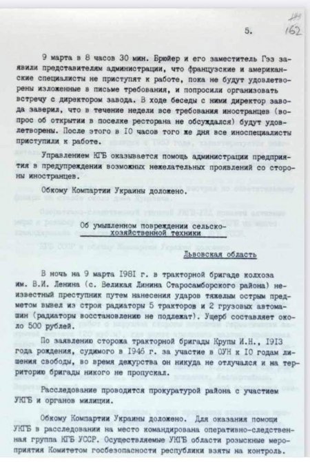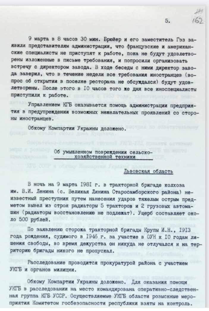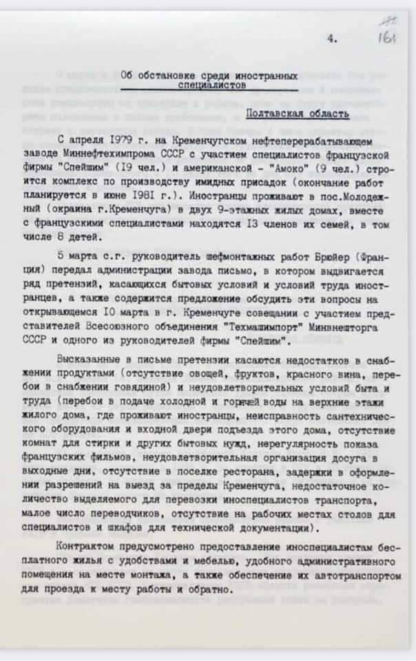 — З квітня 1979 р. на Кременчуцькому нафтопереробному заводі Міннафтохімпрому СРСР за участю фахівців французької фірми «Спейшим» (19 чол.) та американської — «Амоко» (9 чол, Amoco Corporation — американська хімічна та нафтова компанія — ред.) будується комплекс з виробництва імідних присадок (закінчення робіт планується в червні 1981 року). Іноземці проживають у селищі Молодіжний (окраїна м.Кременчука) у двох 9-поверхових житлових будинках, разом із французькими фахівцями перебувають 13 членів їхніх сімей, у тому числі 8 дітей.