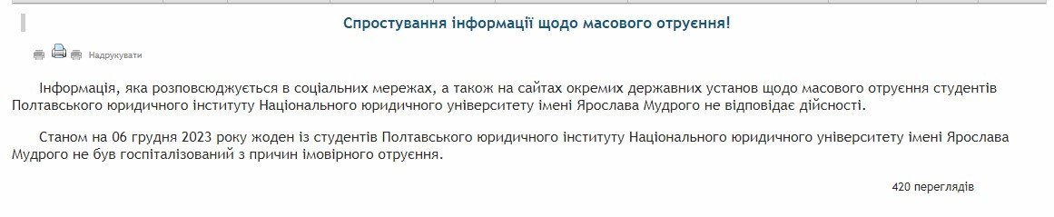 На сайті Полтавського юридичного інституту НЮУ імені Ярослава Мудрого спростували інформацію про масове отруєння студентів.