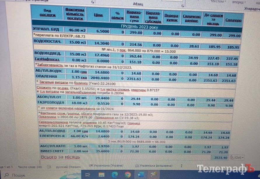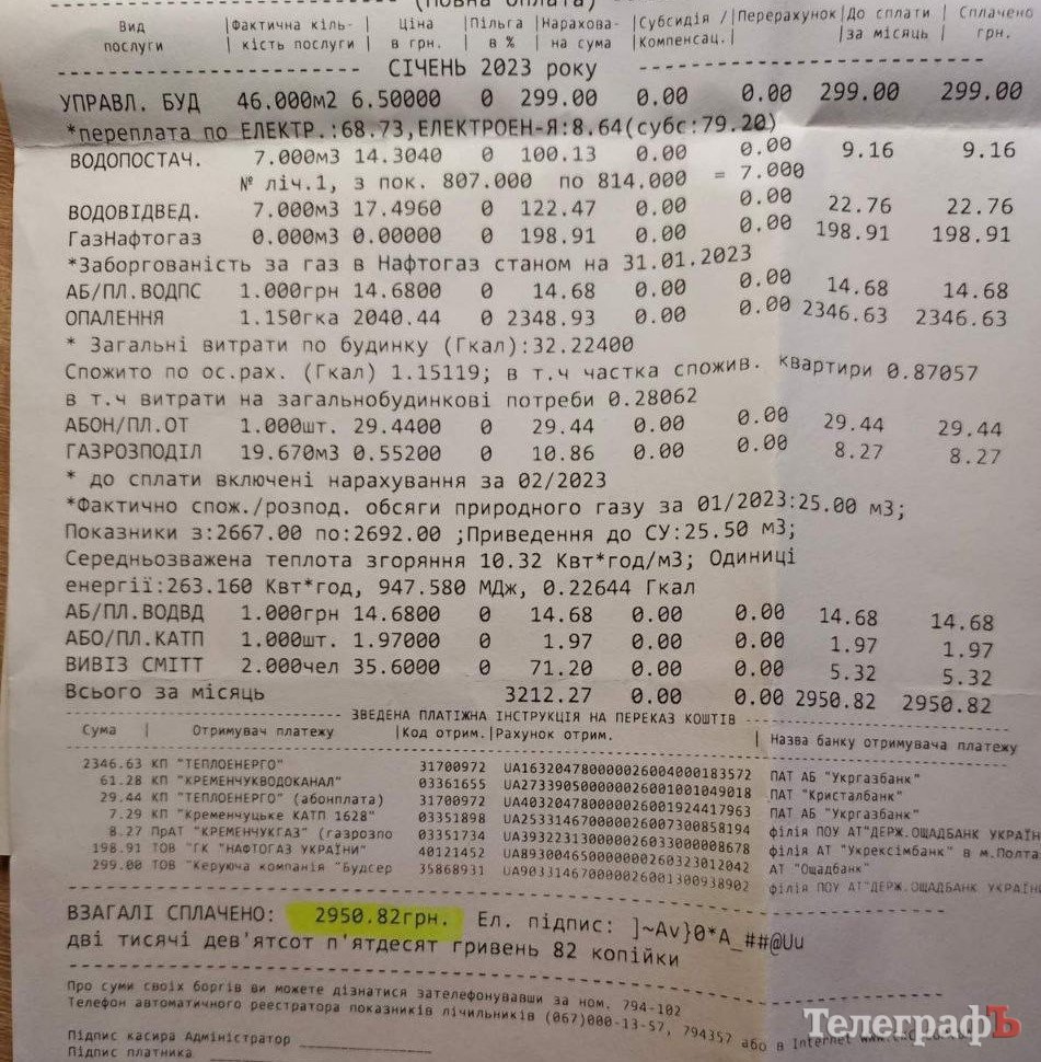 «Кременчуцький Телеграф» вирішив дослідити це питання та порівняти рівень усіх тарифів на комунальні послуги та суми у платіжках, що надіслані містянам за грудень 2023 року з платіжками за грудень 2022 року.