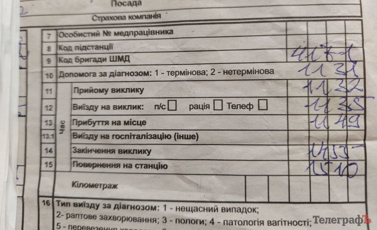 За коментарем «Телеграф» звернувся до директора Кременчуцької станції екстреної медичної допомоги Ігоря Дубницького. Він спростував той факт, що карета «швидкої» їхала до пацієнтки 40 хвилин і показав авторці цього матеріалу картку виїзду, яку бригада швидкої допомоги оформлювала після виклику.
