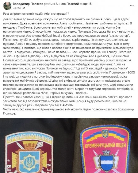18 січня Володимир Поляков написав у Фейсбук, що після початку повномасштабного вторгнення, коли почали гинути випускники ліцею, він «помітив, що ніхто з нового ліцею на поховання не приїжджає».