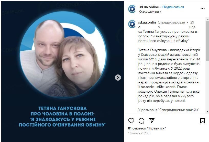 Вперше за два роки, 31 січня 2024 року, дружина полоненого Олексія Ганускова, Тетяна змогла поговорити з чоловіком. Його обміняли разом з іншими 206 полоненими військовослужбовцями. Чоловік пробув в російському полоні рівно 700 днів й нарешті ступив на рідну українську землю.