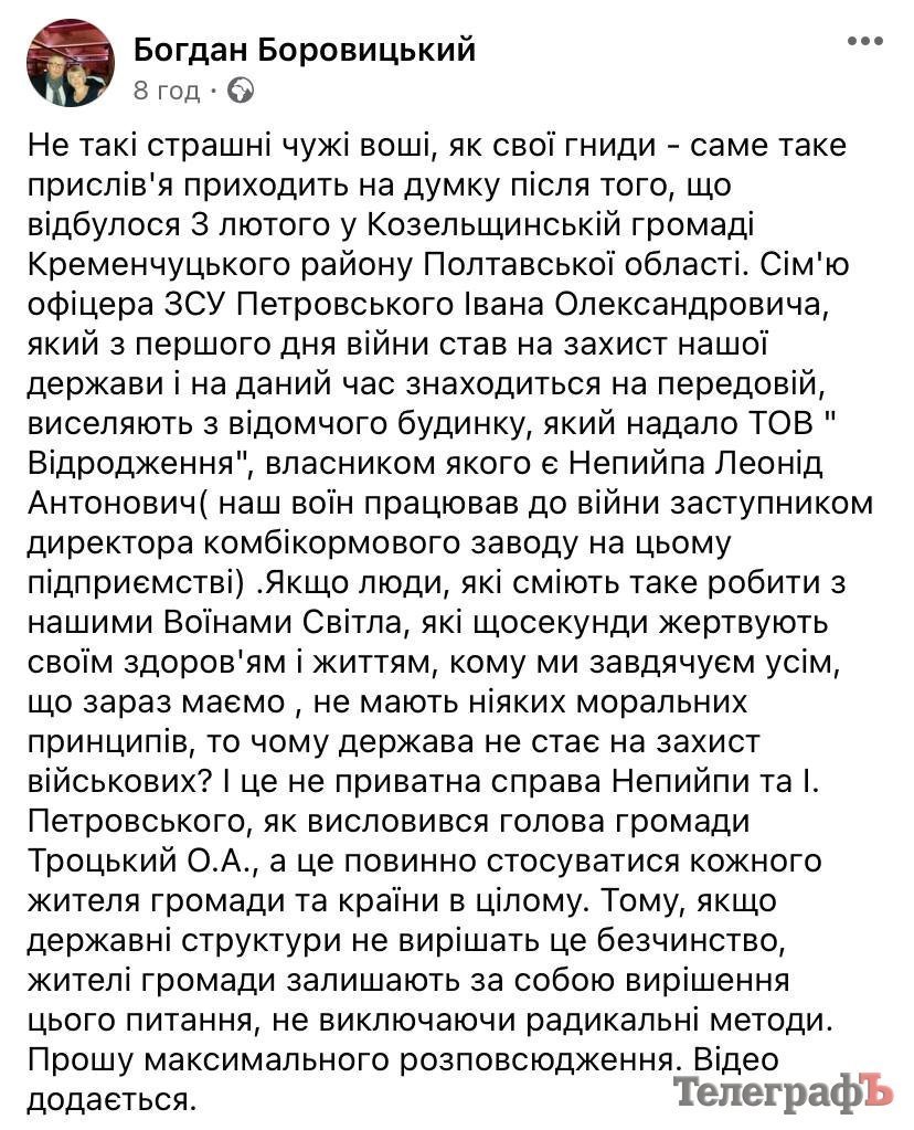 У Козельщинській громаді сім’ю військовослужбовця виселяють з будинку. Про це «Кременчуцькому Телеграфу» розповіла Алла, чоловік якої нині воює. Проживає сім’я у селі Лутовинівка. Чоловік Алли працював заступником директора комбікормового заводу на підприємстві ТОВ «Відродження» з 2019 року. Саме тоді керівництво підприємства надало сім’ї будинок для проживання.